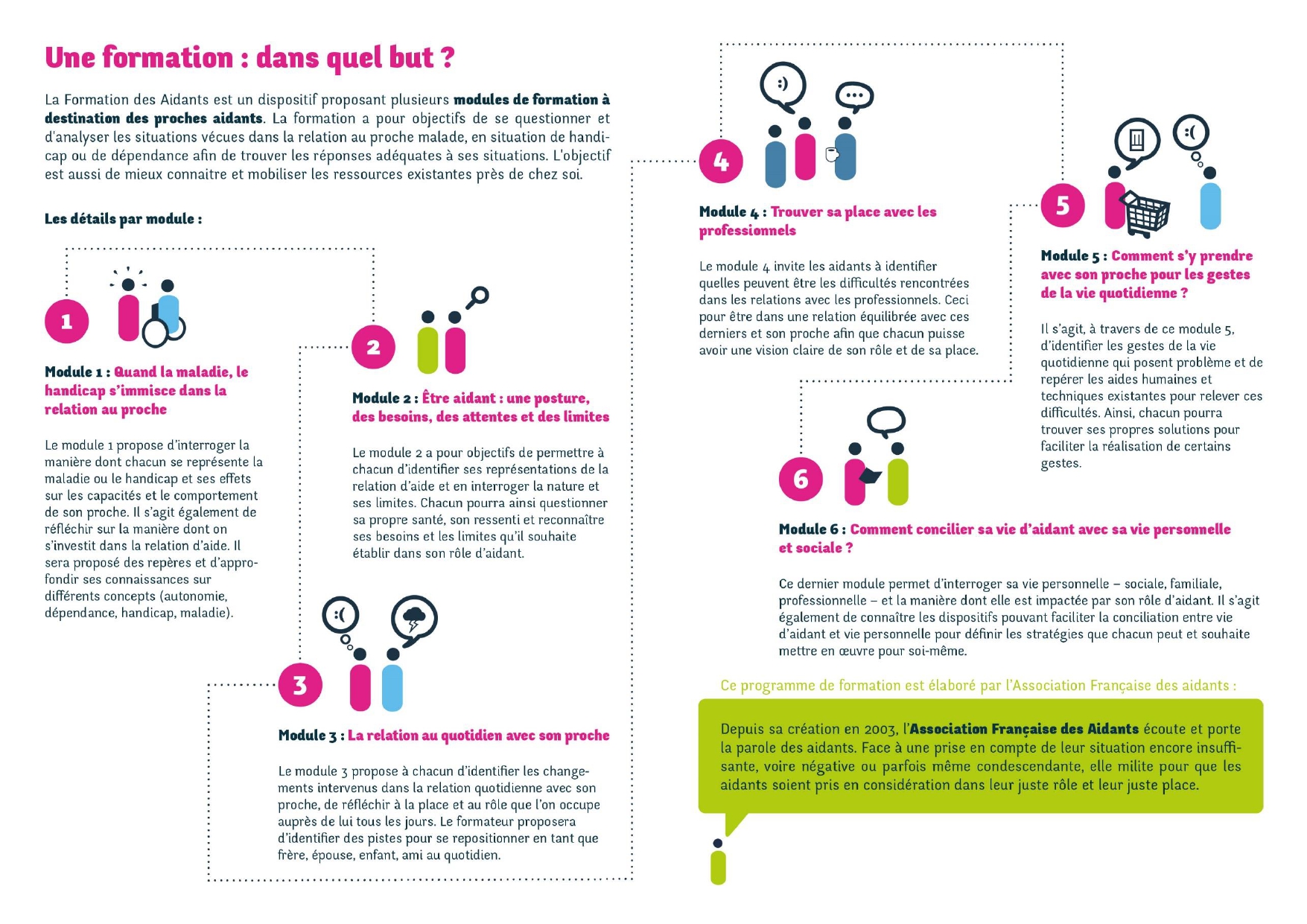 L’Association Soins et Santé et l’Association Française des Aidants vous proposent un programme de formation de 18h séquencé en 6 modules de 3 heures chacun.