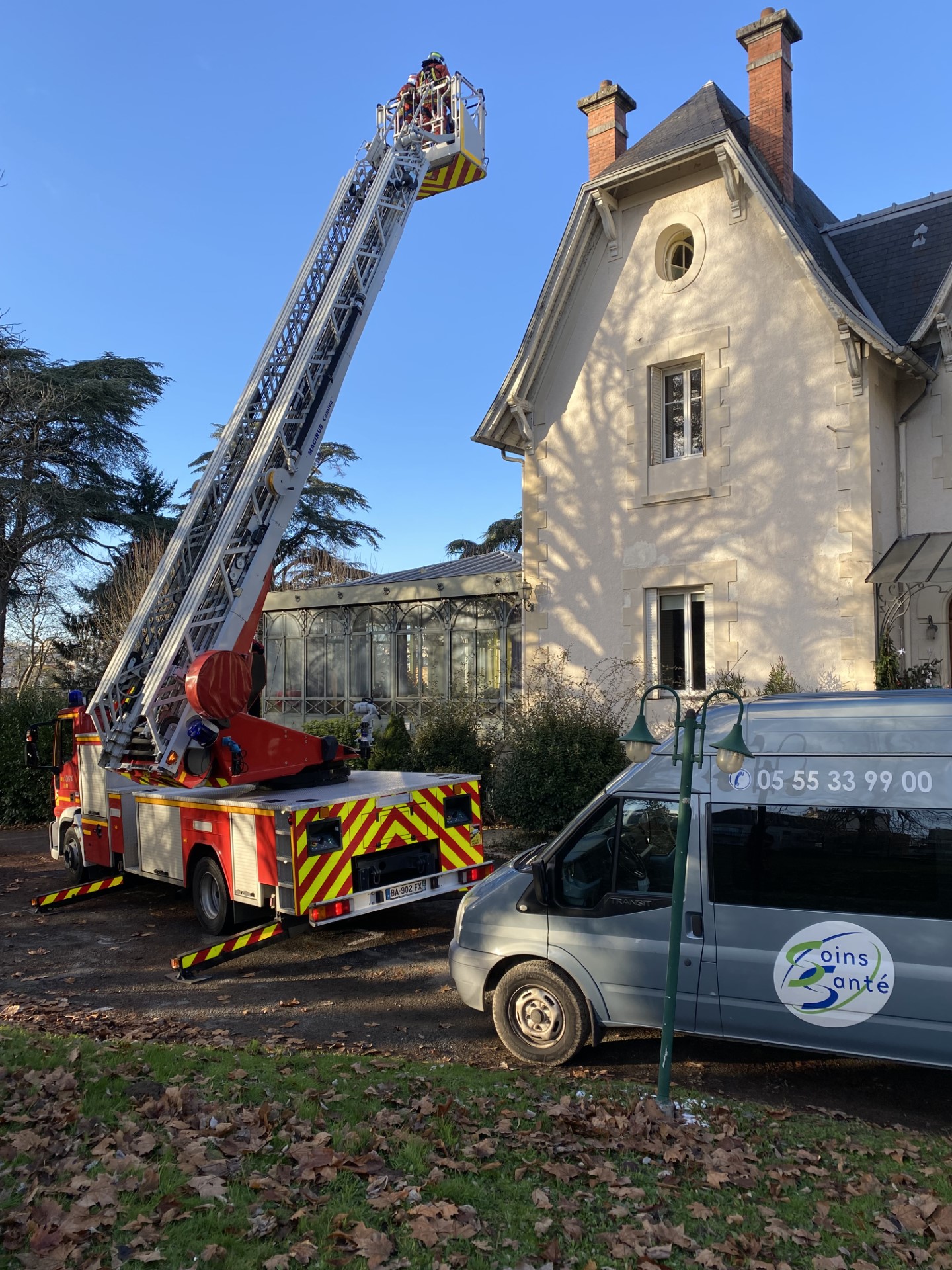 Ce jour, se sont réunis plusieurs sapeurs pompiers de Limoges dans le parc du Castel Marie pour effectuer des manœuvres de sauvetage dans le cadre de leur formation. L’occasion aussi pour les pompiers de bien connaitre le site de Soins et Santé en cas de nécessité et d’intervention des secours.